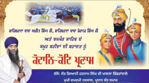 ਅਮਰ ਸ਼ਹੀਦ ਧੰਨ ਧੰਨ ਸਾਹਿਬਜ਼ਾਦਾ ਬਾਬਾ ਅਜੀਤ ਸਿੰਘ ਜੀ ਅਤੇ ਅਮਰ ਸ਼ਹੀਦ ਧੰਨ ਧੰਨ ਸਾਹਿਬਜ਼ਾਦਾ ਬਾਬਾ ਜੋਰਾਵਰ ਸਿੰਘ ਜੀ ਅਤੇ ਸ਼੍ਰੀ ਚਮਕੌਰ ਸਾਹਿਬ ਦੇ ਸਮੂਹ ਸ਼ਹੀਦਾਂ ਦੀ ਸ਼ਹਾਦਤ ਨੂੰ ਕੋਟਨਿ ਕੋਟਿ ਪ੍ਰਨਾਮ। ੮ ਪੋਹ ੨੨ – ੧੨ -੨੦੨੫ ਗੁਰੂ ਪੰਥ ਦੇ ਦਾਸ :- ਸੰਤ ਗਿਆਨੀ ਹਰਨਾਮ ਸਿੰਘ ਜੀ ਖਾਲਸਾ ਭਿੰਡਰਾਂਵਾਲੇ, ਮੁਖੀ ਦਮਦਮੀ ਟਕਸਾਲ, ਪ੍ਰਧਾਨ ਸੰਤ ਸਮਾਜ।