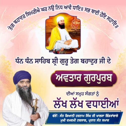 ਤਿਲੁਕ ਜੰਞੂ ਰਾਖਾ ਪ੍ਰਭ ਤਾ ਕਾ॥ ਕੀਨੋ ਬਡੋ ਕਲੂ ਮਹਿ ਸਾਕਾ ॥ ਸਾਧਨੁ ਹੇਤਿ ਇਤੀ ਜਿਨਿ ਕਰੀ॥ ਸੀਸੁ ਦੀਆ ਪਰ ਸੀ ਨ ਉਚਰੀ ॥ ਨੌਵੇ ਪਾਤਸ਼ਾਹ ਧੰਨ ਧੰਨ ਸਾਹਿਬ ਸ਼੍ਰੀ ਗੁਰੂ ਤੇਗ ਬਹਾਦਰ ਸਾਹਿਬ ਜੀ ਮਹਾਰਾਜ ਦੀ ਅਦੁੱਤੀ ਸ਼ਹਾਦਤ ਨੂੰ ਕੋਟਿਨ-ਕੋਟਿ ਪ੍ਰਨਾਮ ਵੱਲੋ : ਸੰਤ ਗਿਆਨੀ ਹਰਨਾਮ ਸਿੰਘ ਜੀ ਖਾਲਸਾ ਭਿੰਡਰਾਂਵਾਲੇ ਮੁਖੀ ਦਮਦਮੀ ਟਕਸਾਲ, ਪ੍ਰਧਾਨ ਸੰਤ ਸਮਾਜ।