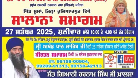 ਮਹਾਨ ਪਰਉਕਾਰੀ ਮਹਾਂਪੁਰਸ਼ ਸੰਤ ਬਾਬਾ ਜਵਾਹਰ ਦਾਸ ਜੀ ਦੀ 106ਵੀਂ ਸਾਲਾਨਾ ਬਰਸੀ ਡੇਰਾ ਬਾਬਾ ਜਵਾਹਰ ਦਾਸ ਜੀ ਚੈਰੀਟੇਬਲ ਟਰੱਸਟ ( ਰਜਿ) ਨਗਰ ਸੂਸਾਂ ਹੁਸ਼ਿਆਪੁਰ (ਬ੍ਰਾਂਚ ਜਥੇਬੰਦੀ ਦਮਦਮੀ ਟਕਸਾਲ ਜਥਾ ਭਿੰਡਰਾਂ ਮਹਿਤਾ ) ਵਿਖੇ ਮਿਤੀ 27 ਸਤੰਬਰ 2025 ਦਿਨ ਸ਼ਨੀਵਾਰ ਸਵੇਰੇ 10 ਵਜੇ ਤੋਂ ਸ਼ਾਮ 4 ਵਜੇ ਤੱਕ ਸ਼੍ਰੀਮਾਨ ਸੰਤ ਬਾਬਾ ਹਰਨਾਮ ਸਿੰਘ ਜੀ ਖਾਲਸਾ ਭਿੰਡਰਾਂਵਾਲੇ ਮੁਖੀ ਦਮਦਮੀ ਟਕਸਾਲ ਮਹਾਂਪੁਰਸ਼ਾਂ ਦੀ ਯੋਗ ਅਗੁਵਾਈ ‘ਚ ਬੜੀ ਸ਼ਰਧਾ ਭਾਵਨਾ ਅਤੇ ਚੜ੍ਹਦੀਕਲਾ ਨਾਲ ਮਨਾਈ ਜਾ ਰਹੀ ਹੈ । ਸਮੂਹ ਸੰਗਤਾਂ ਨੂੰ ਬੇਨਤੀ ਹੈ ਦਰਸ਼ਨ ਦੇਣ ਦੀ ਕ੍ਰਿਪਾਲਤਾ ਕਰੋ ਜੀ ।