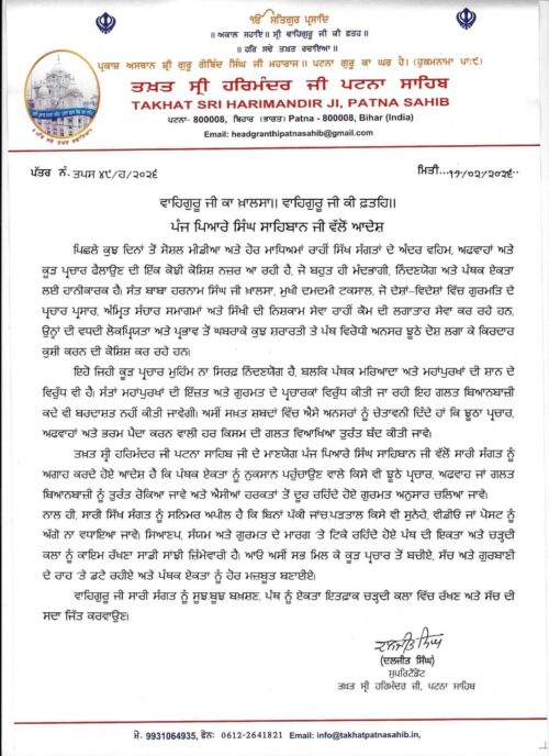 ਸ਼੍ਰੀਮਾਨ ਸੰਤ ਬਾਬਾ ਹਰਨਾਮ ਸਿੰਘ ਜੀ ਖਾਲਸਾ ਭਿੰਡਰਾਂਵਾਲੇ ਮੁਖੀ ਦਮਦਮੀ ਟਕਸਾਲ ਮਹਾਂਪੁਰਸ਼ਾਂ ਪ੍ਰਤੀ ਸ਼ੋਸ਼ਲ ਮੀਡੀਆ ਤੇ ਕੂੜ ਪ੍ਰਚਾਰ ਕਰਨ ਵਾਲਿਆਂ ਨੂੰ ਤਖਤ ਸ਼੍ਰੀ ਹਰਿਮੰਦਰ ਜੀ ਪਟਨਾ ਸਾਹਿਬ ਜੀ ਦੇ ਪੰਜ ਪਿਆਰੇ ਸਿੰਘ ਸਾਹਿਬਾਨ ਵੱਲੋਂ ਸਖਤ ਤਾੜਨਾ ਦਾ ਆਦੇਸ਼ ਤਖਤ ਸ਼੍ਰੀ ਹਰਿਮੰਦਰ ਸਾਹਿਬ ਜੀ ਪਟਨਾ ਸਾਹਿਬ ਜੀ ਦੇ ਸੁਪਰਡੈਂਟ ਸ: ਦਲਜੀਤ ਸਿੰਘ ਵੱਲੋਂ ਜਾਰੀ ਕੀਤਾ ਗਿਆ ।