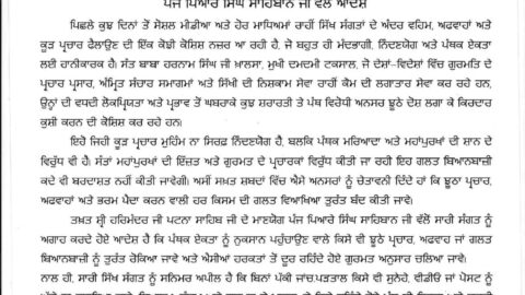 ਤਖਤ ਸ਼੍ਰੀ ਹਰਿਮੰਦਰ ਜੀ ਪਟਨਾ ਸਾਹਿਬ ਦੇ ਪੰਜ ਪਿਆਰੇ ਸਿੰਘ ਸਾਹਿਬਾਨ ਵੱਲੋਂ ਆਦੇਸ਼