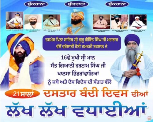 ਦਸਮ ਪਿਤਾ ਸਾਹਿਬ ਸ਼੍ਰੀ ਗੁਰੂ ਗੋਬਿੰਦ ਸਿੰਘ ਸਾਹਿਬ ਜੀ ਮਹਾਰਾਜ ਜੀ ਵੱਲੋਂ ਆਪਣੇ ਕਰ ਕਮਲਾ ਦੁਆਰਾ ਵਰਸੋਈ ਜਥੇਬੰਦੀ ਦਮਦਮੀ ਟਕਸਾਲ ਦੇ ਵਰਤਮਾਨ 16ਵੇਂ ਮੁਖੀ ਸ਼੍ਰੀਮਾਨ ਸੰਤ ਬਾਬਾ ਹਰਨਾਮ ਸਿੰਘ ਜੀ ਖਾਲਸਾ ਭਿੰਡਰਾਂਵਾਲਿਆਂ ਦੀ ਸਮੁੱਚੇ ਦਮਦਮੀ ਟਕਸਾਲ ਜਥੇ ਵਲ਼ੋਂ ਮਿਤੀ 27 ਦਸੰਬਰ 2004 ਨੂੰ ਜਥੇਬੰਦੀ ਦੇ ਮੁਖੀ ਵਜੋਂ ਸੇਵਾਵਾਂ ਗੁਰੂ ਸਾਹਿਬ ਜੀ ਦੀ ਹਜੂਰੀ ‘ਚ ਸੇਵਾਵਾਂ ਬਖਸ਼ਿਸ ਕੀਤੀਆਂ ਗਈਆਂ ਸਨ । ਇਸ ਸਾਲ 2025 ‘ਚ ਮਹਾਂਪੁਰਸ਼ਾਂ ਦੀ ਦਸਤਾਰਬੰਦੀ ਨੂੰ 21 ਸਾਲਾ ਹੋਣ ਤੇ, ਜਥੇਬੰਦੀ ਵੱਲੋਂ ਗੁਰੂ ਸਾਹਿਬ ਜੀ ਦਾ ਕੋਟਿਨ ਕੋਟਿ ਸ਼ੁਕਰਾਨਾ ਅਤੇ ਮਹਾਂਪੁਰਸ਼ਾਂ ਨੂੰ ਦਸਤਾਰਬੰਦੀ ਦੀਆਂ ਲੱਖ ਲੱਖ ਵਧਾਈਆਂ ਹੋਣ ਜੀ