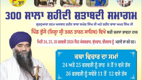 ਸ਼ਹੀਦ ਬਾਬਾ ਬਘੇਲ ਸਿੰਘ ਜੀ, ਸ਼ਹੀਦ ਬਾਬਾ ਅਮਰ ਸਿੰਘ ਅਤੇ ਸ਼ਹੀਦ ਬਾਬਾ ਤਾਰਾ ਸਿੰਘ ਜੀ ਵਾਂ ਦੀ 300 ਸਾਲਾ ਸ਼ਹੀਦੀ ਸ਼ਤਾਬਦੀ ਦੇ ਸਮਾਗਮ ਗੁਰੁਦੁਆਰਾ ਜਨਮ ਅਸਥਾਨ ਸ਼ਹੀਦ ਬਾਬਾ ਬਘੇਲ ਸਿੰਘ ਜੀ ਅਤੇ ਸ਼ਹੀਦ ਬਾਬਾ ਅਮਰ ਸਿੰਘ ਜੀ ਨਗਰ ਭੁੱਸੇ ਜਿਲ੍ਹਾ ਸ਼੍ਰੀ ਤਰਨ ਤਾਰਨ ਸਾਹਿਬ ਵਿਖੇ ਬੜੀ ਸ਼ਰਧਾ ਭਾਵਨਾ ਨਾਲ ਮਿਤੀ 24 ,25 ਫਰਵਰੀ ਨੂੰ ਮਨਾਈ ਜਾ ਰਹੀ ਹੈ । ਮੁੱਖ ਸਮਾਗਮ ਮਿਤੀ 26 ਫਰਵਰੀ 2026 ਨੂੰ ਮਨਾਇਆ ਜਾ ਰਿਹਾ ਹੈ ਜਿਸ ਵਿਚ ਦਮਦਮੀ ਟਕਸਾਲ ਦੇ ਮੌਜੂਦਾ ਮੁਖੀ ਸੰਤ ਬਾਬਾ ਹਰਨਾਮ ਸਿੰਘ ਜੀ ਖਾਲਸਾ ਭਿੰਡਰਾਂਵਾਲੇ 24 ਅਤੇ 25 ਫਰਵਰੀ ਨੂੰ ਰਾਤ 8 ਤੋਂ 9 ਵਜੇ ਤੱਕ ਅਤੇ ਮੁਖ ਸਮਾਗਮ ‘ਚ 26 ਫ਼ਰਵਰੀ ਨੂੰ ਸਵੇਰੇ 11 ਤੋਂ 12 ਵਜੇ ਤੱਕ ਕਥਾ ਦੀ ਹਾਜਰੀ ਭਰਨਗੇ। ਸਮੂਹ ਸੰਗਤ ਨੂੰ ਬੇਨਤੀ ਹੈ ਕਿ ਇਹਨਾਂ ਸਮਾਗਮਾਂ ‘ਚ ਦਰਸ਼ਨ ਦੇਣ ਦੀ ਕ੍ਰਿਪਾਲਤਾ ਕਰੋ ਜੀ ਅਤੇ ਸਹੀਦਾਂ ਦੀਆਂ ਖੁਸ਼ੀਆਂ ਪ੍ਰਾਪਤ ਕਰੋ ਜੀ ।