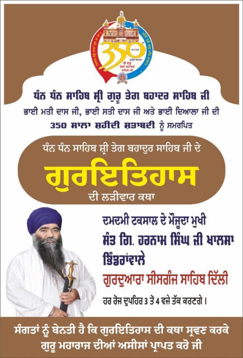 ਧੰਨ ਧੰਨ ਸਾਹਿਬ ਸ਼੍ਰੀ ਗੁਰੂ ਤੇਗ ਬਹਾਦੁਰ ਸਾਹਿਬ ਜੀ , ਭਾਈ ਮਤੀ ਦਾਸ ਜੀ, ਸਤੀ ਦਾਸ ਜੀ ਅਤੇ ਭਾਈ ਦਿਆਲ ਦਾਸ ਜੀ ਦੀ 350 ਸਾਲਾ ਮਹਾਨ ਸ਼ਹੀਦੀ ਸ਼ਤਾਬਦੀ ਨੂੰ ਸਮਰਪਿਤ ਗੁ: ਸ਼੍ਰੀ ਸੀਸ ਗੰਜ ਸਾਹਿਬ ਜੀ ( ਦਿੱਲੀ ) ਵਿਖੇ ਰੋਜਾਨਾ 3 ਤੋਂ 4 ਵਜੇ ਤੱਕ ਗੁਰ ਇਤਿਹਾਸ ਦੀ ਕਥਾ ਵਿਚਾਰ ਦੀ ਹਾਜਰੀ ਸ਼੍ਰੀਮਾਨ ਸੰਤ ਬਾਬਾ ਹਰਨਾਮ ਸਿੰਘ ਜੀ ਖਾਲਸਾ ਭਿੰਡਰਾਂਵਾਲੇ ਮੁਖੀ ਦਮਦਮੀ ਟਕਸਾਲ ਹਾਜਰੀ ਭਰਨਗੇ । ਸਮੂਹ ਸੰਗਤਾਂ ਗੁਰੂ ਜਸ ਸ੍ਰਵਣ ਕਰਕੇ ਲਾਹਾ ਪ੍ਰਾਪਤ ਕਰੋ ਜੀ