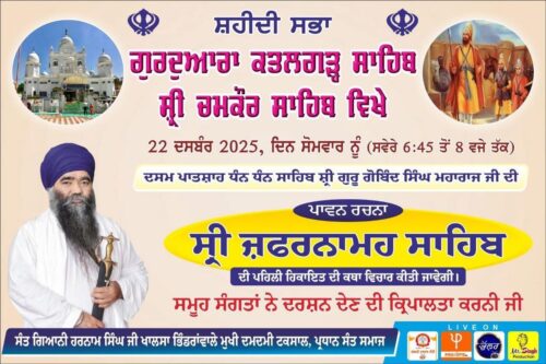 ਪਾਵਨ ਸ਼ਹੀਦੀ ਅਸਥਾਨ ਗੁਰੁਦਆਰਾ ਸ਼੍ਰੀ ਕਤਲਗੜ੍ਹ ਸਾਹਿਬ ਸ਼੍ਰੀ ਚਮਕੌਰ ਸਾਹਿਬ ਜੀ ਵਿਖੇ ਮਿਤੀ 22 ਦਸੰਬਰ 2025 ਦਿਨ ਸੋਮਵਾਰ ਨੂੰ ਸਵੇਰੇ 6:45 ਤੋਂ 8 ਵਜੇ ਤੱਕ ਧੰਨ ਧੰਨ ਸਾਹਿਬ ਸ਼੍ਰੀ ਗੁਰੂ ਗੋਬਿੰਦ ਸਿੰਘ ਜੀ ਮਹਾਰਾਜ ਦੀ ਪਾਵਨ ਪਵਿੱਤਰ ਰਚਨਾ ਸ੍ਰੀ ਜਫਰਨਾਮਹ ਸਾਹਿਬ ਦੀ ਪਹਿਲੀ ਹਿਕਾਇਤ ਦੀ ਕਥਾ ਵਿਚਾਰ ਦਮਦਮੀ ਟਕਸਾਲ ਦੇ ਮੁਖੀ ਸੰਤ ਗਿ.ਹਰਨਾਮ ਸਿੰਘ ਜੀ ਖਾਲਸਾ ਭਿੰਡਰਾਂਵਾਲੇ ਕਰਣਗੇ ।ਸਮੂਹ ਸੰਗਤਾਂ ਨੇ ਦਰਸ਼ਨ ਦੇਣ ਦੀ ਕ੍ਰਿਪਾਲਤਾ ਕਰਣੀ ਜੀ