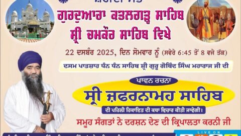 ਪਾਵਨ ਸ਼ਹੀਦੀ ਅਸਥਾਨ ਗੁਰੁਦਆਰਾ ਸ਼੍ਰੀ ਕਤਲਗੜ੍ਹ ਸਾਹਿਬ ਸ਼੍ਰੀ ਚਮਕੌਰ ਸਾਹਿਬ ਜੀ ਵਿਖੇ ਮਿਤੀ 22 ਦਸੰਬਰ 2025 ਦਿਨ ਸੋਮਵਾਰ ਨੂੰ ਸਵੇਰੇ 6:45 ਤੋਂ 8 ਵਜੇ ਤੱਕ ਧੰਨ ਧੰਨ ਸਾਹਿਬ ਸ਼੍ਰੀ ਗੁਰੂ ਗੋਬਿੰਦ ਸਿੰਘ ਜੀ ਮਹਾਰਾਜ ਦੀ ਪਾਵਨ ਪਵਿੱਤਰ ਰਚਨਾ ਸ੍ਰੀ ਜਫਰਨਾਮਹ ਸਾਹਿਬ ਦੀ ਪਹਿਲੀ ਹਿਕਾਇਤ ਦੀ ਕਥਾ ਵਿਚਾਰ ਦਮਦਮੀ ਟਕਸਾਲ ਦੇ ਮੁਖੀ ਸੰਤ ਗਿ.ਹਰਨਾਮ ਸਿੰਘ ਜੀ ਖਾਲਸਾ ਭਿੰਡਰਾਂਵਾਲੇ ਕਰਣਗੇ ।ਸਮੂਹ ਸੰਗਤਾਂ ਨੇ ਦਰਸ਼ਨ ਦੇਣ ਦੀ ਕ੍ਰਿਪਾਲਤਾ ਕਰਣੀ ਜੀ