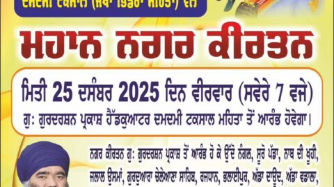 ਦਮਦਮੀ ਟਕਸਾਲ ਜਥੇਬੰਦੀ ਦੇ ਬਾਨੀ, ਧੰਨ ਧੰਨ ਸਾਹਿਬ ਸਤਿਗੁਰੂ ਸ਼੍ਰੀ ਗੁਰੂ ਗੋਬਿੰਦ ਸਿੰਘ ਸਾਹਿਬ ਜੀ ਮਹਾਰਾਜ ਸਾਹਿਬ ਜੀ ਦੇ ਪਾਵਨ ਅਵਤਾਰ ਗੁਰਪੁਰਬ ਦਿਹਾੜ੍ਹੇ ਨੂੰ ਸਮਰਪਿਤ, ਸਾਲਾਨਾ ਮਹਾਨ ਨਗਰ ਕੀਰਤਨ, ਦਮਦਮੀ ਟਕਸਾਲ ਦੇ ਹੈੱਡਕੁਆਟਰ ਗੁ: ਗੁਰਦਰਸ਼ਨ ਪ੍ਰਕਾਸ਼ ਮਹਿਤਾ ਤੋਂ, ਸ਼੍ਰੀਮਾਨ ਸੰਤ ਬਾਬਾ ਹਰਨਾਮ ਸਿੰਘ ਜੀ ਖਾਲਸਾ ਭਿੰਡਰਾਂਵਾਲੇ ਮੁਖੀ ਦਮਦਮੀ ਟਕਸਾਲ ਮਹਾਂਪੁਰਸ਼ਾਂ ਦੀ ਅਗੁਵਾਈ ‘ਚ ਮਿਤੀ 25 ਦਸੰਬਰ 2025 ਨੂੰ ਬੜ੍ਹੀ ਚੜ੍ਹਦੀਕਲਾ ਨਾਲ ਸਜਾਇਆ ਜਾ ਰਿਹਾ ਹੈ । ਸਮੂਹ ਇਲਾਕਾ ਨਿਵਾਸੀ ਸੰਗਤਾਂ ਇਸ ਨਗਰ ਕੀਰਤਨ ‘ਚ ਹਾਜਰੀਆਂ ਭਰਕੇ, ਗੁਰੂ ਜਸ ਸ੍ਰਵਣ ਕਰੋ ਅਤੇ ਲਾਹੇ ਪ੍ਰਾਪਤ ਕਰੋ ਜੀ ਵੱਲੋਂ :- ਦਮਦਮੀ ਟਕਸਾਲ (ਜਥਾ ਭਿੰਡਰਾਂ ਮਹਿਤਾ)