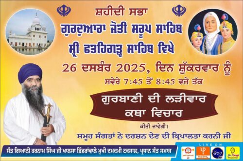 ਅਮਰ ਸ਼ਹੀਦ ਧੰਨ ਧੰਨ ਬਾਬਾ ਜੋਰਾਵਰ ਸਿੰਘ ਸਾਹਿਬ ਜੀ ,ਅਮਰ ਸ਼ਹੀਦ ਧੰਨ ਧੰਨ ਫਤਹਿ ਸਿੰਘ ਸਿੰਘ ਜੀ ਅਤੇ ਧੰਨ ਧੰਨ ਮਾਤਾ ਗੁਜਰ ਕੌਰ ਜੀ ਦੇ ਪਾਵਨ ਸਸਕਾਰ ਅਸਥਾਨ ਗੁ: ਸ਼੍ਰੀ ਜੋਤੀ ਸਰੂਪ ਸਾਹਿਬ ਜੀ ਵਿਖੇ ਸ਼ਹੀਦੀ ਸਭਾ ਦੇ ਦਿਹਾੜ੍ਹਿਆ ‘ਤੇ ਮਿਤੀ 26 ਦਸੰਬਰ 2025 ਨੂੰ ਸਵੇਰੇ 7:45 ਤੋਂ 8:45ਤੱਕ ਗੁਰਬਾਣੀ ਦੀ ਲੜੀਵਾਰ ਕਥਾ ਦੀ ਹਾਜਰੀ ਸ਼੍ਰੀਮਾਨ ਸੰਤ ਬਾਬਾ ਹਰਨਾਮ ਸਿੰਘ ਜੀ ਖਾਲਸਾ ਭਿੰਡਰਾਂਵਾਲੇ ਮੁਖੀ ਦਮਦਮੀ ਟਕਸਾਲ ਮਹਾਂਪੁਰਸ਼ ਭਰਨਗੇ । ਸਮੂਹ ਸੰਗਤਾਂ ਨੂੰ ਬੇਨਤੀ ਹੈ ਹਾਜਰੀਆਂ ਭਰਕੇ ਲਾਹੇ ਪ੍ਰਾਪਤ ਕਰੋ ਜੀ