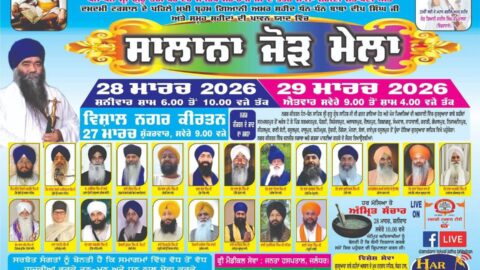 ਦਮਦਮੀ ਟਕਸਾਲ (ਜਥਾ ਭਿੰਡਰਾਂ ਮਹਿਤਾ) ਦੀ ਬ੍ਰਾਂਚ, ਗੁ: ਬਾਬੇ ਸ਼ਹੀਦਾਂ,ਨਗਰ ਸਰਮਸਤਪੁਰ ਜਿਲ੍ਹਾ ( ਜਲੰਧਰ) ਵਿਖੇ, ਸਮੂਹ ਸ਼ਹੀਦਾਂ ਸਿੰਘਾਂ ਦੀ ਯਾਦ ‘ਚ, ਸਾਲਾਨਾ ਜੋੜ ਮੇਲਾ, ਮਿਤੀ 28-29 ਮਾਰਚ 2026 ਨੂੰ ,ਸ਼੍ਰੀਮਾਨ ਸੰਤ ਬਾਬਾ ਹਰਨਾਮ ਸਿੰਘ ਜੀ ਖਾਲਸਾ ਭਿੰਡਰਾਂਵਾਲੇ ਮੁਖੀ ਦਮਦਮੀ ਟਕਸਾਲ ਪ੍ਰਧਾਨ ਸੰਤ ਸਮਾਜ ਮਹਾਂਪੁਰਸ਼ਾਂ ਦੀ ਅਗਵਾਈ ‘ਚ ਕਰਵਾਇਆ ਜਾ ਰਿਹਾ ਹੈ । ਸਮੂਹ ਸੰਗਤਾਂ ਨੂੰ ਬੇਨਤੀ ਹੈ ਇਹਨਾਂ ਸਮਾਗਮਾਂ ‘ਚ ਹਾਜਰੀਆਂ ਭਰੋ ਅਤੇ ਸ਼ਹੀਦਾਂ ਦੀਆਂ ਖੁਸ਼ੀਆਂ ਪ੍ਰਾਪਤ ਕਰੋ ਜੀ । ਨੋਟ :- ਮਿਤੀ 27 ਮਾਰਚ 2026 ਨੂੰ ਬਹੁਤ ਭਾਰੀ ਮਹਾਨ ਨਗਰ ਕੀਰਤਨ ਸਜਾਏ ਜਾਣਗੇ ਸਮੂਹ ਸੰਗਤਾਂ ਨੂੰ ਬੇਨਤੀ ਹੈ ਨਗਰ ਕੀਰਤਨ ‘ਚ ਵੀ ਹਾਜਰੀਆਂ ਭਰੋ ਜੀ