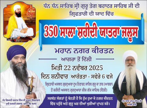 Damdami Taksal, , Events & Updates, 0ਧੰਨ ਧੰਨ ਸਾਹਿਬ ਸ੍ਰੀ ਗੁਰੂ ਤੇਗ ਬਹਾਦਰ ਸਾਹਿਬ ਜੀ ਦੀ ਗ੍ਰਿਫਤਾਰੀ ਦੀ ਯਾਦ ਵਿੱਚ 350 ਸਾਲਾ ਸ਼ਹੀਦੀ ਯਾਤਰਾ ਜਲੂਸ (ਮਹਾਨ ਨਗਰ ਕੀਰਤਨ) ਮਿਤੀ 22 ਨਵੰਬਰ 2025 ਦਿਨ ਸ਼ਨੀਵਾਰ ਨੂੰ ਸਵੇਰੇ 6 ਵਜੇ ਆਰੰਭ ਹੋਣਗੇ ।