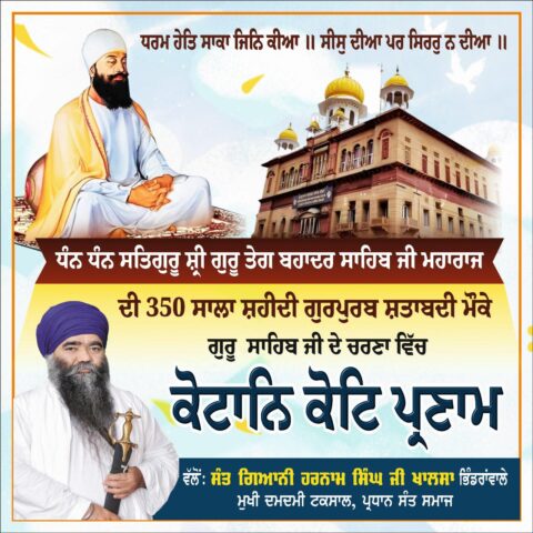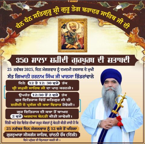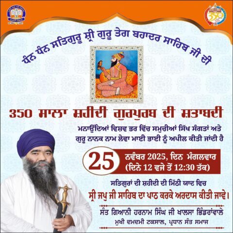 ਗੁਰੂ ਸਾਹਿਬ ਜੀ ਦੀ 350 ਸਾਲਾ ਸ਼ਹੀਦੀ ਗੁਰਪੁਰਬ ਦੀ ਸ਼ਤਾਬਦੀ ਦੀ ਮਿਠੀ ਯਾਦ ਵਿਚ ਮਿਤੀ 25 ਨਵੰਬਰ 2025 ਨੂੰ ਦੁਪਹਿਰ 12 ਵਜੇ ਸ਼੍ਰੀ ਜਪੁਜੀ ਸਾਹਿਬ ਜੀ ਦੇ ਪਾਠ ਆਰੰਭ ਕਰਕੇ 12:24 ਤੇ ਪਾਠ ਦੀ ਸਮਾਪਤੀ ਕਰਕੇ ਅਰਦਾਸ ਕੀਤੀ ਜਾਵੇ :- ਸੰਤ ਗਿ:ਹਰਨਾਮ ਸਿੰਘ ਜੀ ਖਾਲਸਾ ਭਿੰਡਰਾਂਵਾਲੇ ,ਮੁਖੀ ਦਮਦਮੀ ਟਕਸਾਲ, ਪ੍ਰਧਾਨ ਸੰਤ ਸਮਾਜ
