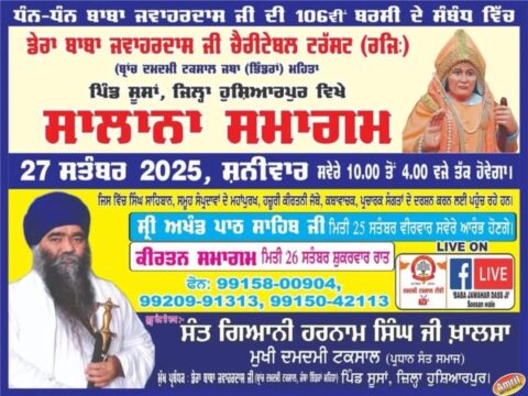 ਮਹਾਨ ਪਰਉਕਾਰੀ ਮਹਾਂਪੁਰਸ਼ ਸੰਤ ਬਾਬਾ ਜਵਾਹਰ ਦਾਸ ਜੀ ਦੀ 106ਵੀਂ ਸਾਲਾਨਾ ਬਰਸੀ ਡੇਰਾ ਬਾਬਾ ਜਵਾਹਰ ਦਾਸ ਜੀ ਚੈਰੀਟੇਬਲ ਟਰੱਸਟ ( ਰਜਿ) ਨਗਰ ਸੂਸਾਂ ਹੁਸ਼ਿਆਪੁਰ (ਬ੍ਰਾਂਚ ਜਥੇਬੰਦੀ ਦਮਦਮੀ ਟਕਸਾਲ ਜਥਾ ਭਿੰਡਰਾਂ ਮਹਿਤਾ ) ਵਿਖੇ ਮਿਤੀ 27 ਸਤੰਬਰ 2025 ਦਿਨ ਸ਼ਨੀਵਾਰ ਸਵੇਰੇ 10 ਵਜੇ ਤੋਂ ਸ਼ਾਮ 4 ਵਜੇ ਤੱਕ ਸ਼੍ਰੀਮਾਨ ਸੰਤ ਬਾਬਾ ਹਰਨਾਮ ਸਿੰਘ ਜੀ ਖਾਲਸਾ ਭਿੰਡਰਾਂਵਾਲੇ ਮੁਖੀ ਦਮਦਮੀ ਟਕਸਾਲ ਮਹਾਂਪੁਰਸ਼ਾਂ ਦੀ ਯੋਗ ਅਗੁਵਾਈ ‘ਚ ਬੜੀ ਸ਼ਰਧਾ ਭਾਵਨਾ ਅਤੇ ਚੜ੍ਹਦੀਕਲਾ ਨਾਲ ਮਨਾਈ ਜਾ ਰਹੀ ਹੈ । ਸਮੂਹ ਸੰਗਤਾਂ ਨੂੰ ਬੇਨਤੀ ਹੈ ਦਰਸ਼ਨ ਦੇਣ ਦੀ ਕ੍ਰਿਪਾਲਤਾ ਕਰੋ ਜੀ ।